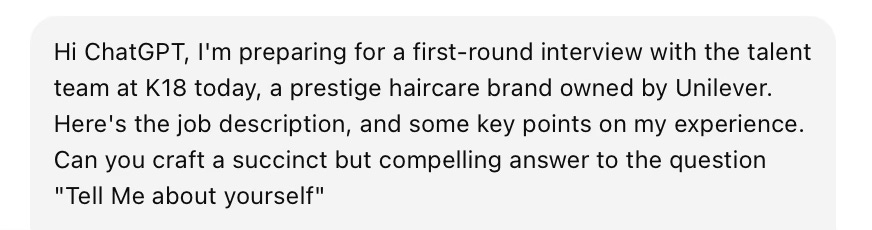 AI is your secret weapon. I used it extensively throughout my search, especially in the interview stage. One of my favorite use cases is pre-interview. Upload the job spec and your resume to ChatGPT. Ask for a detailed briefing on the company and the executive you’ll be interviewing with (inclusive of sources), likely interview questions based on the listing, and tailored talking points drawn from your own experience.